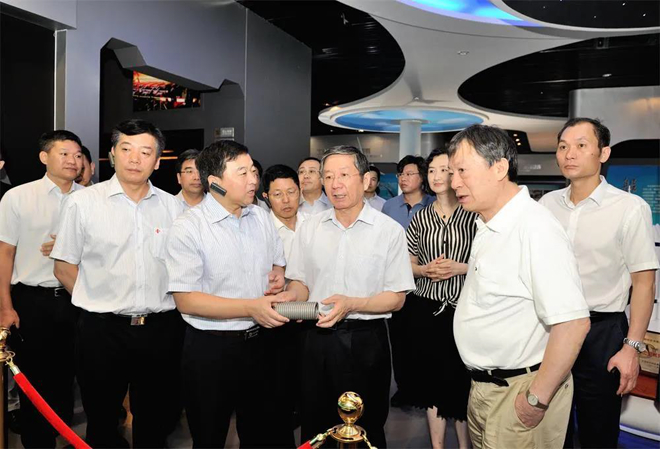 2019年7月20日,中國航空發動機集團有限公司董事長曹建國、中國工程院院士向巧一行來大冶特鋼考察。中信泰富特鋼黨委書記、董事長錢剛,中國工程院院士劉玠、大冶特鋼總經理謝文新等陪同。(特約通訊員 朱友鬆 攝)