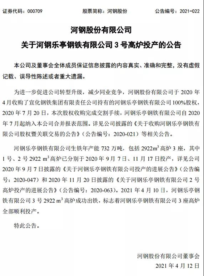 4月12日,河鋼股份發布《關於河鋼樂亭鋼鐵有限公司3號高爐投產的公告》(以下簡稱“《公告》”)。