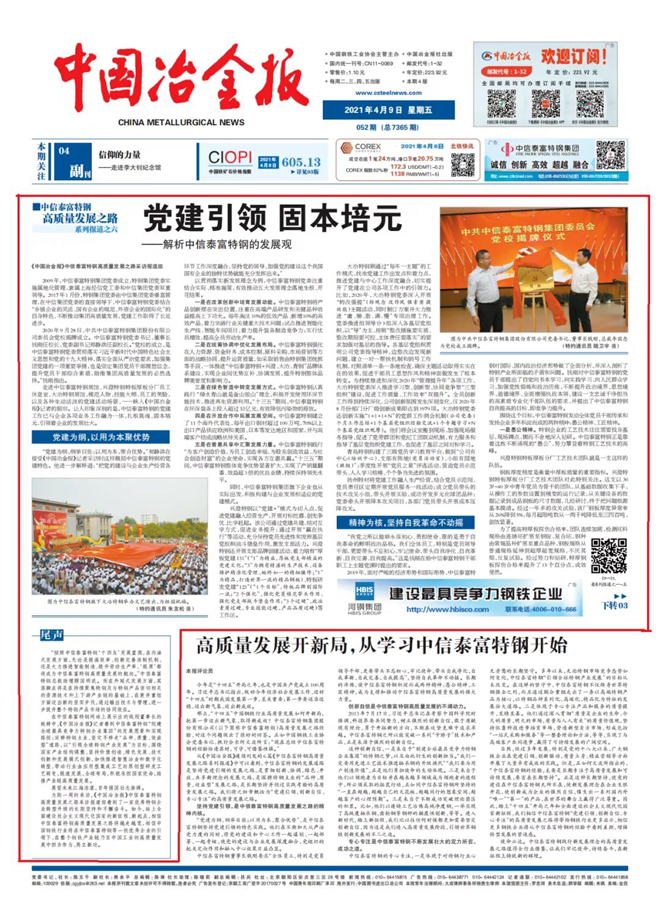 (《中國冶金報》中信泰富特鋼高質量發展之路采訪報道組:陳玉千、陳琢、呂兵、劉加軍、何惠平;賈林海、陳曦、溫曉霞、周利勇、燕衛平對本文亦有貢獻。)