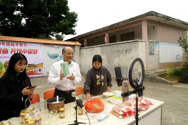 扶貧幹部吳建輝進行直播帶貨,為南畝鎮扶貧產品積極代言。(來源:陳立新)