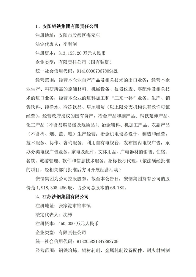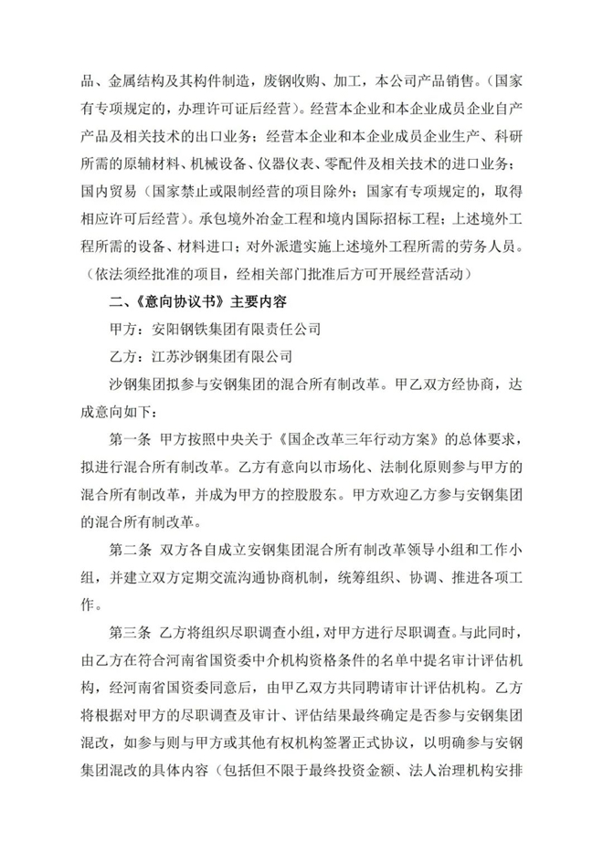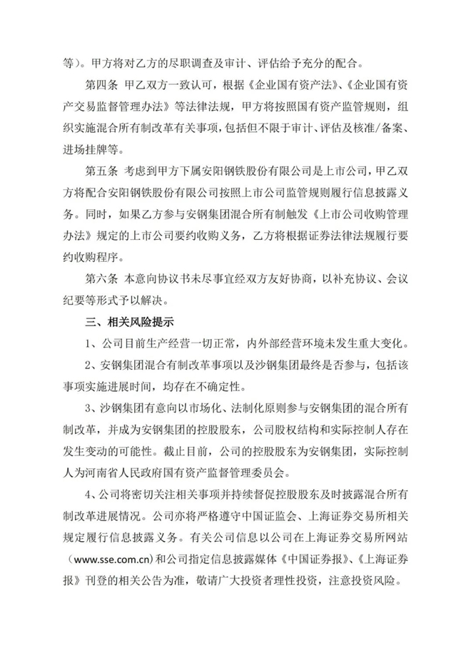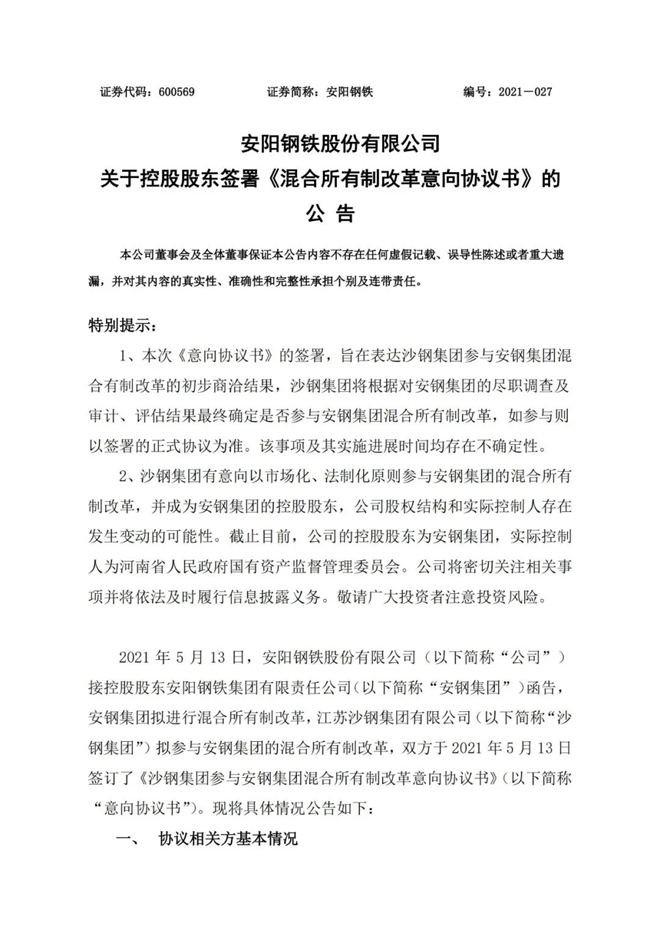 5月13日,安陽鋼鐵股份有限公司(以下簡稱“公司”)發布公告,稱其接控股股東安陽鋼鐵集團有限責任公司(以下簡稱“安鋼集團”)函告,安鋼集團擬進行混合所有製改革,江蘇沙鋼集團有限公司(以下簡稱“沙鋼集團”)擬參與安鋼集團的混合所有製改革,雙方於2021年5月13日簽訂了《沙鋼集團參與安鋼集團混合所有製改革意向協議書》(以下簡稱“《意向協議書》”)。