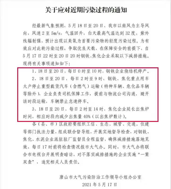 5月17日,唐山市大氣汙染防治工作領導小組辦公室發布《關於應對近期汙染過程的通知》(簡稱“《通知》”)。《通知》稱,5月18日至20日,唐山市預計出現以臭氧為首要汙染物的輕度汙染過程,為有效應對此輪汙染過程,5月18日至20日,每日0時至10時,鋼鐵企業燒結機停產。