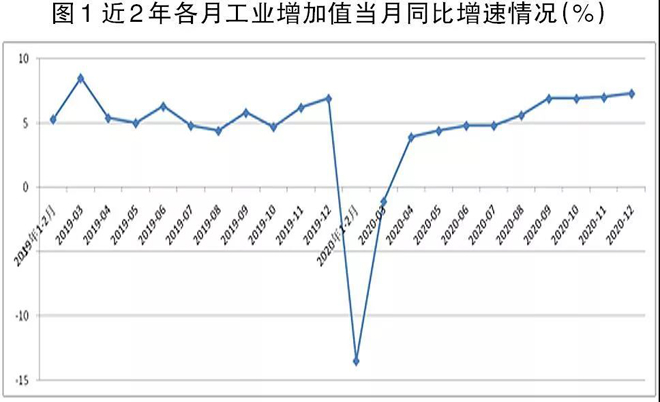 國家統計局按月發布2月~12月份每月工業增加值累計增速、3月~12月份每月工業增加值當月增速。從工業增加值當月同比角度看(1月、2月份工業增加值當月同比用1月~2月份累計同比表示),2020年1月~2月份工業增加值增速大幅下降至-13.5%,3月份增速收窄至-1.1%;自4月份起,各月份工業增加值當月同比轉為正增長,且工業增加值當月同比增速呈現逐月擴大的態勢,如4月份工業增加值當月同比增速為3.9%,此後逐月上升,12月份上升至7.3%(見圖1),為2020年工業增加值當月同比的最高值。