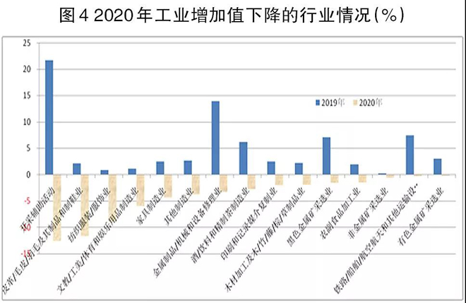通過對行業的代表性產品屬性進行比較,筆者將15個增加值負增長行業分為4類。第一類是采礦業,涉及有色金屬礦采選業、非金屬礦采選業、開采輔助活動3個行業;第二類是設備製造業,僅涉及鐵路/船舶/航空航天和其他運輸設備製造業、金屬製品/機械和設備修理業2個行業;第三類是能源動力行業,僅涉及燃氣生產和供應業;第四類是以居民消費品生產為主的行業,即傳統的輕工行業,涉及紡織服裝/服飾業、皮革/毛皮/羽毛及其製品和製鞋業等9個行業。上述現象表明,2020年受新冠肺炎疫情影響,社會居民消費增長受到抑製,從而逆向傳導至社會消費品生產行業,導致這些產業綜合產量出現了下降。