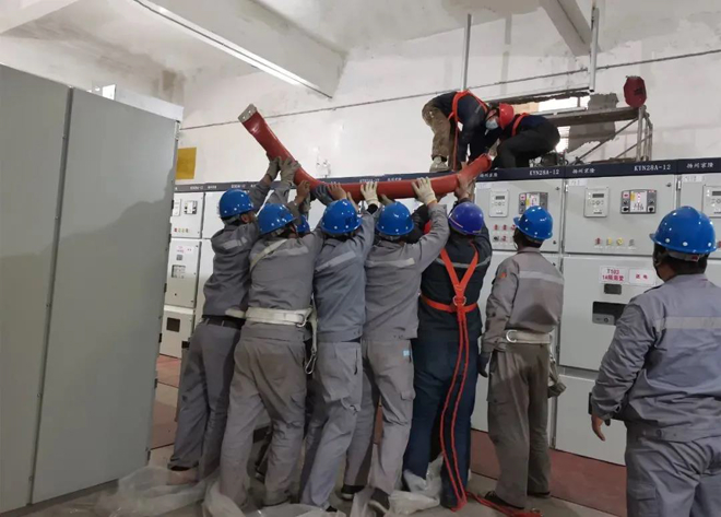 設備年修中,能源中心的員工正在合力更換配電櫃的進線端
