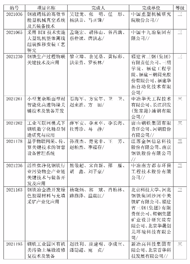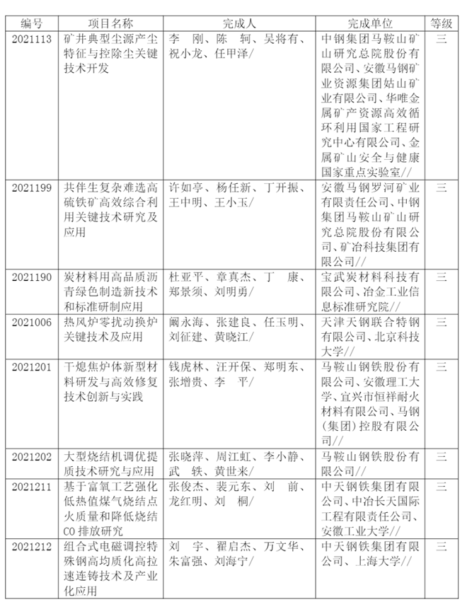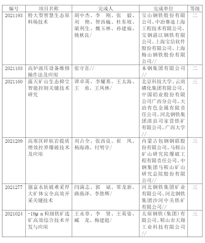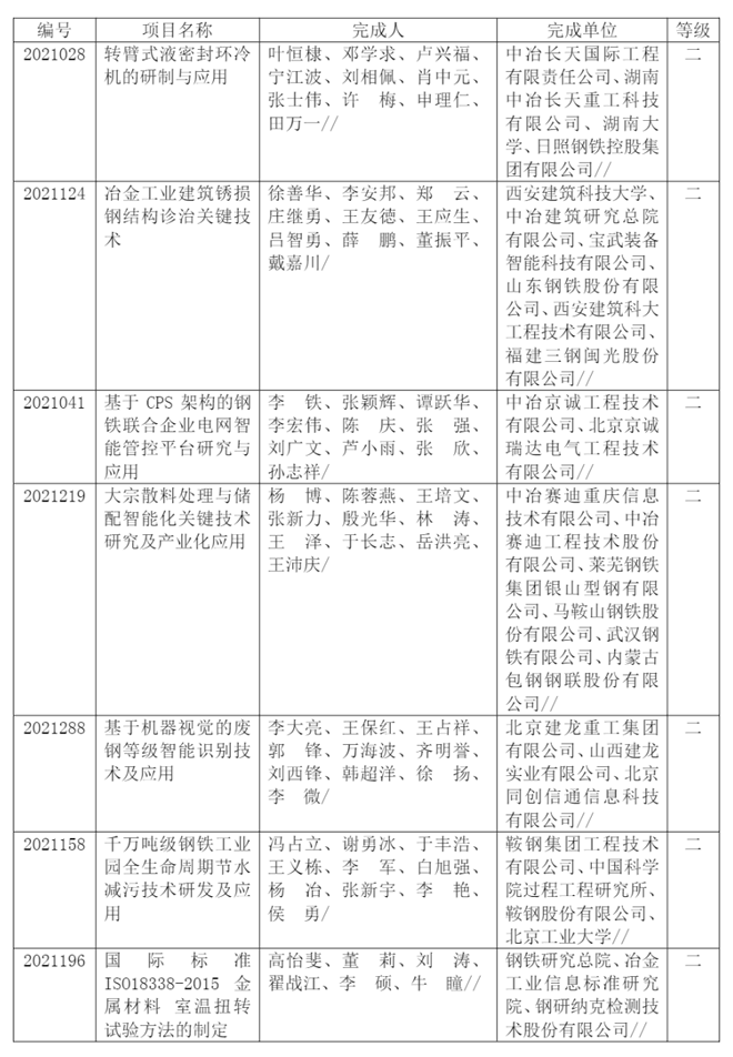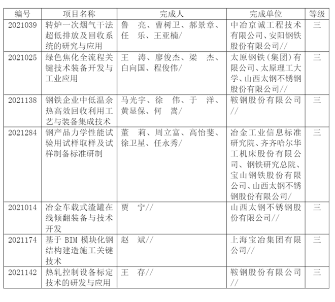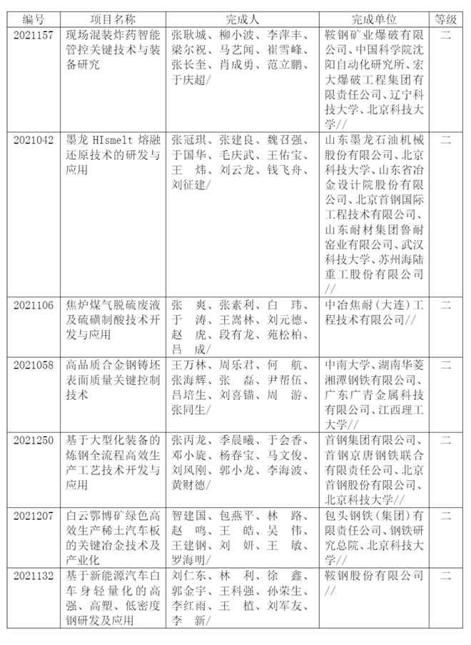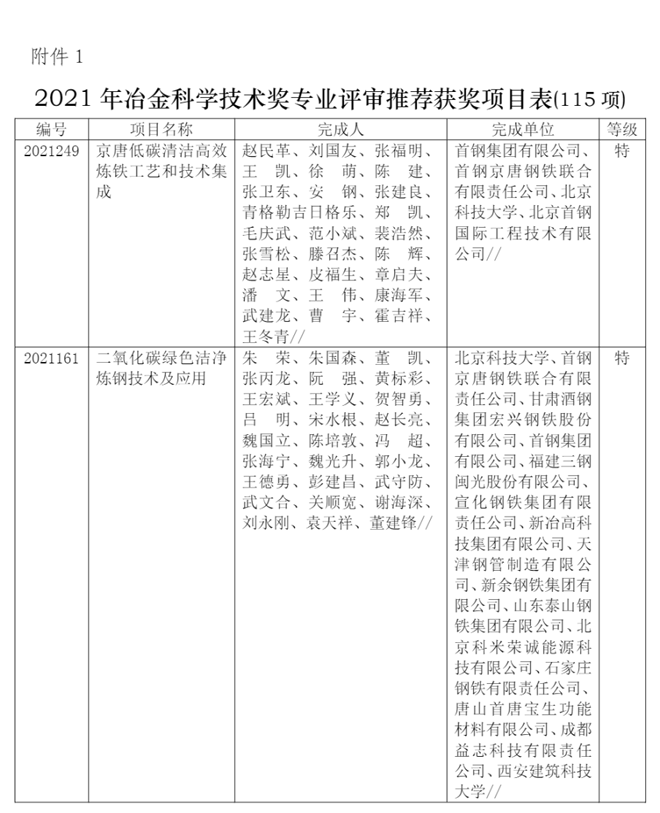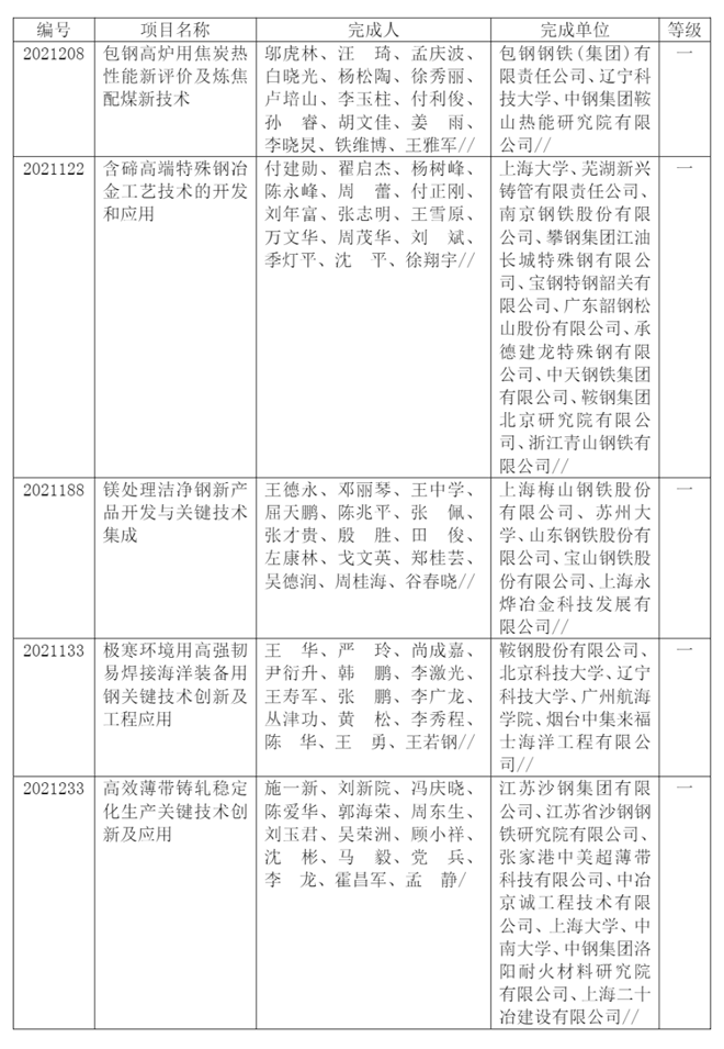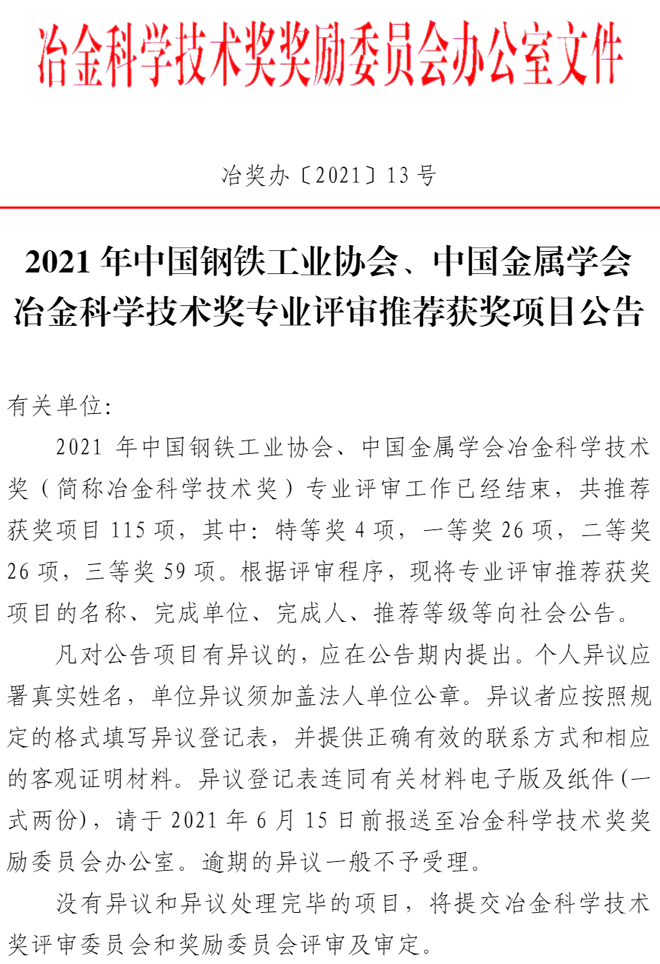據中國鋼鐵工業協會消息,2021年中國鋼鐵工業協會、中國金屬學會冶金科學技術獎(簡稱”冶金科學技術獎“)專業評審工作已經結束,共推薦獲獎項目115項,其中:特等獎4項,一等獎26項,二等獎26項,三等獎59項。