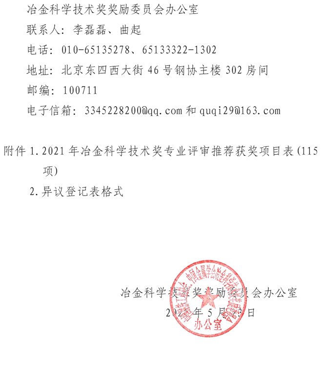 2021年冶金科學技術獎專業評審推薦獲獎項目發布!