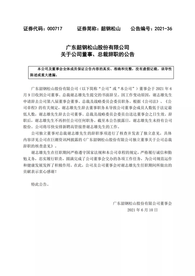 6月9日,韶鋼鬆山曾經發布公告,因工作變動原因,謝誌雄申請辭去公司第八屆董事會董事、總裁及戰略委員會委員職務,不再擔任公司任何職務,公司將盡快安排新聘高管接替謝誌雄的工作。