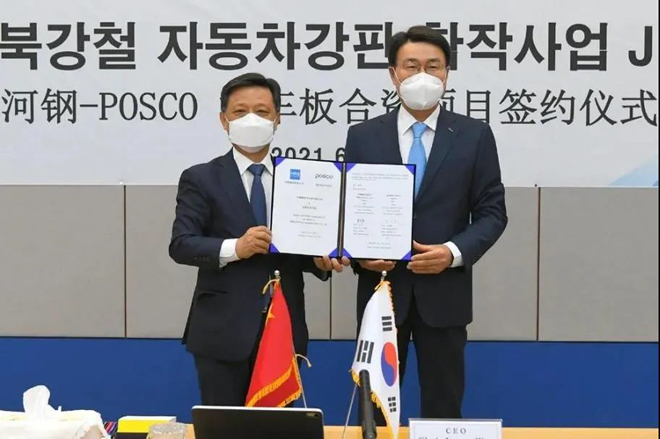 6月25日,河鋼與POSCO(浦項)以視頻會議形式舉行了河鋼—POSCO汽車板合資項目簽約儀式,正式實施年產能達135萬噸的高端汽車麵板項目。