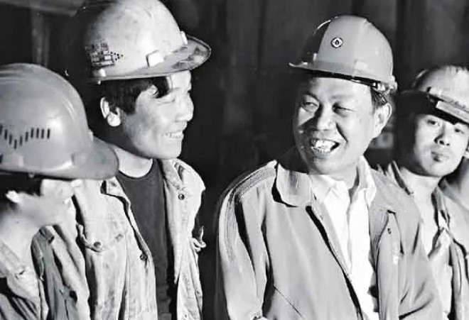 圖為“邯鋼經驗”創造者劉漢章(左三)與邯鋼工人在一起。(本報資料圖片)