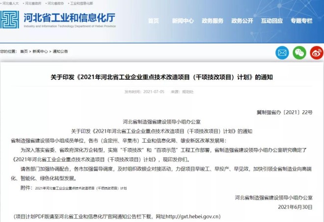 通知表明,為深入落實河北省委、省政府深化萬企轉型,實施“千項技改”和“百項示範”工程工作部署,河北省製造強省建設領導小組辦公室研究確定了《2021年河北省工業企業重點技術改造項目(千項技改項目)計劃》。