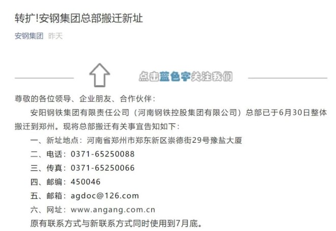 7月11日,安鋼集團官微宣布,安陽鋼鐵集團有限責任公司(河南鋼鐵控股集團有限公司)總部已於6月30日整體搬遷到鄭州。