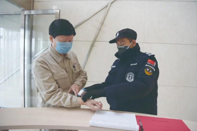 警衛人員對上班職工進行體溫檢測。