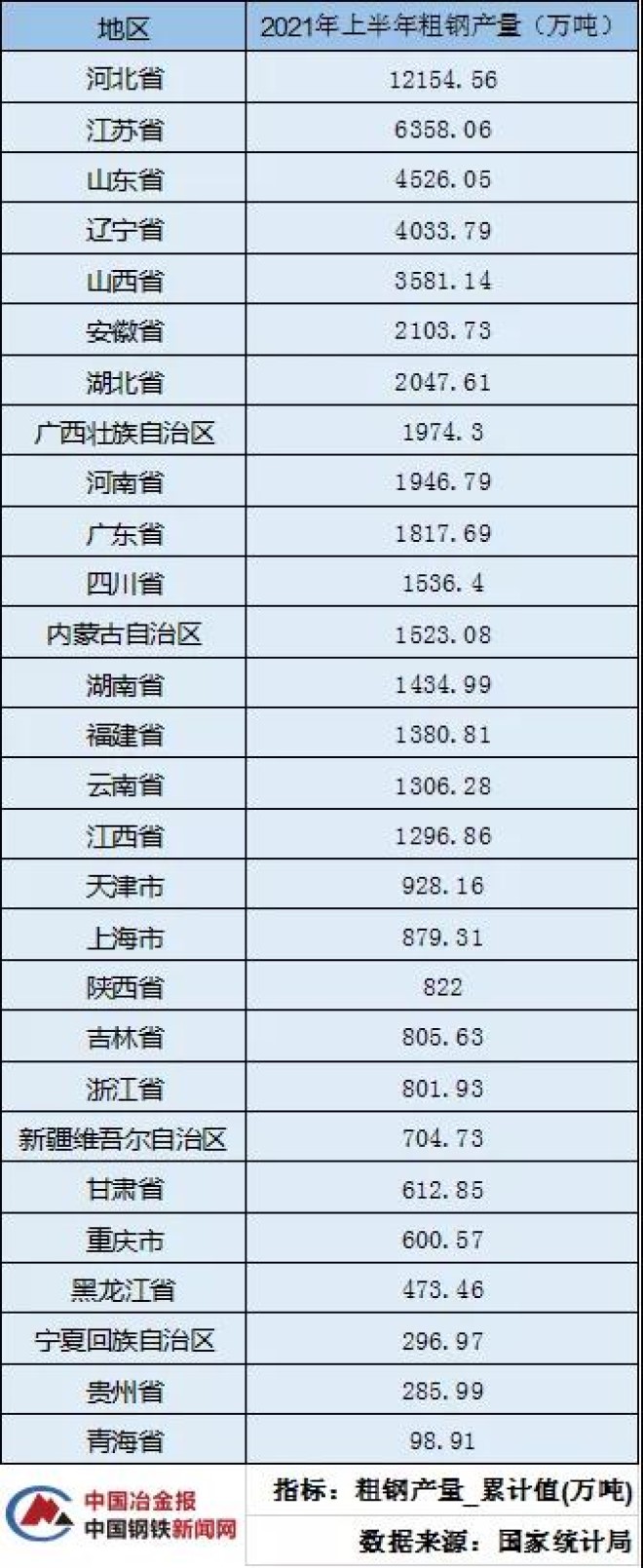 近日,國家統計局公布了2021年上半年31省市自治區粗鋼產量數據。