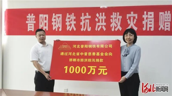 8月4日上午,河北普陽鋼鐵有限公司向河北省邯鄲市捐款1000萬元,用於幫助當地恢複生產和災後重建。