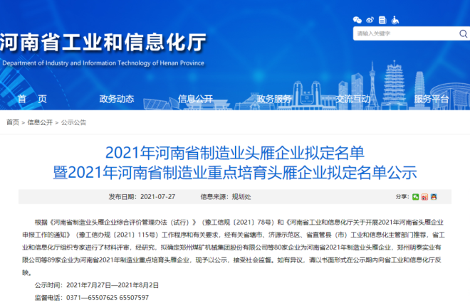近日,河南省工業與信息化廳官網發布了《2021年河南省製造業頭雁企業擬定名單暨2021年河南省製造業重點培育頭雁企業擬定名單公示》,擬確定80家企業為河南省2021年製造業頭雁企業,89家企業為河南省2021年製造業重點培育頭雁企業,並予以公示。其中,共有6家鋼鐵企業入選頭雁企業擬定名單,3家鋼鐵企業入選重點培育頭雁企業擬定名單。