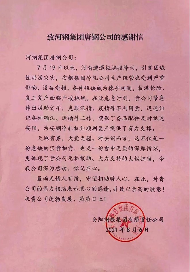 暴雨無情人有情 守望相助暖人心——安鋼感謝河鋼唐鋼助其複產