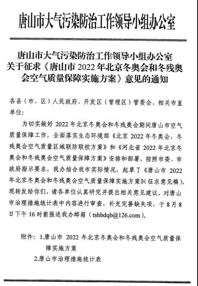 近日,唐山市大氣汙染防治工作領導小組辦公室發布關於征求《唐山市2022年北京冬奧會和冬殘奧會空氣質量保障實施方案》意見的通知(以下簡稱《意見稿》),內容主要是對鋼鐵企業的高爐及配套的焦化、石灰進行不同比例的停限產,並禁止國五及以下重卡的運輸,時間自方案發布之日起至2022年3月13日。