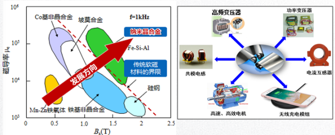鐵基納米晶合金是當今綜合性能最優的金屬軟磁材料,具有高飽和磁感應強度、高磁導率、低損耗等特性,且具有製備和應用雙節能的優勢,是提升電能傳輸效率、實現電控/電訊/電磁屏蔽的核心基礎材料,廣泛應用於電力電子、新能源汽車、智能電網、信息通訊等戰略新興產業。