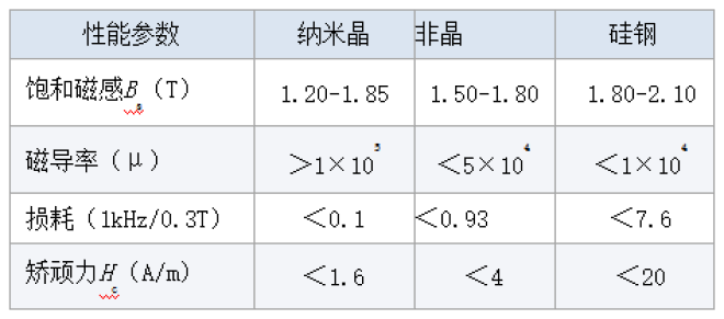 相比較而言,低碳鋼加工性能好,但渦流損耗大,隻宜用於直流鐵芯;矽鋼具有高飽和磁感應強度,在不超過1kHz的頻率下應用優勢顯著,尤其適用於低頻、大功率電磁裝備,而在更高頻下應用損耗急劇增加;坡莫合金具有很高的磁導率,但成本很高,主要用於精密儀表、記錄磁頭等或要求體積小的場合;鐵基非晶合金具有較高飽和磁感應強度和較低中頻損耗特性,適合在50Hz-10kHz頻率範圍應用,在更高頻率應用時磁導率快速下降;納米晶合金因其具有獨特的非晶/納米晶雙相複合結構,兼備高頻高磁導率和高頻低損耗特性,在50Hz-100kHz頻率範圍應用具有顯著優勢,如表1所示。