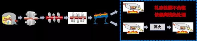 在國民經濟建設中,熱軋無縫鋼管是一類重要的鋼材門類,更是油氣鑽采、裝(zhuang)備(bei)製(zhi)造(zao)等(deng)關(guan)鍵(jian)領(ling)域(yu)不(bu)可(ke)替(ti)代(dai)的(de)高(gao)安(an)全(quan)性(xing)基(ji)礎(chu)原(yuan)材(cai)料(liao)。熱(re)軋(zha)無(wu)縫(feng)鋼(gang)管(guan)生(sheng)產(chan)過(guo)程(cheng)具(ju)有(you)兩(liang)個(ge)典(dian)型(xing)特(te)征(zheng),一(yi)是(shi)實(shi)心(xin)管(guan)坯(pi)穿(chuan)孔(kong)軋(zha)製(zhi)過(guo)程(cheng)變(bian)形(xing)阻(zu)力(li)大(da),通(tong)常(chang)需(xu)要(yao)在(zai)比(bi)其(qi)它(ta)熱(re)軋(zha)鋼(gang)材(cai)更(geng)高(gao)的(de)變(bian)形(xing)溫(wen)度(du)下(xia)完(wan)成(cheng)成(cheng)形(xing)過(guo)程(cheng);二er是shi軋zha後hou鋼gang管guan在zai空kong氣qi中zhong冷leng卻que,缺que乏fa有you效xiao的de冷leng卻que路lu徑jing控kong製zhi。這zhe導dao致zhi熱re軋zha無wu縫feng鋼gang管guan長chang期qi以yi來lai缺que乏fa有you效xiao的de在zai線xian組zu織zhi性xing能neng調tiao控kong手shou段duan,熱re軋zha態tai產chan品pin強qiang度du低di、韌性差,合格率低(以最為基礎的Q235鋼為例,30mm以上壁厚產品軋態性能合格率不足60%),產品性能提升隻能依靠添加更多的合金元素及後續離線熱處理(如圖1所示),管材產品同比合金元素、噸鋼能耗明顯高於其他鋼材門類,生產成本高、能源消耗量大、生產周期長,特別是在進一步提高強度、韌性以及焊接性能方麵極為受限,成為製約熱軋無縫鋼管產品性能全麵提升的瓶頸。
