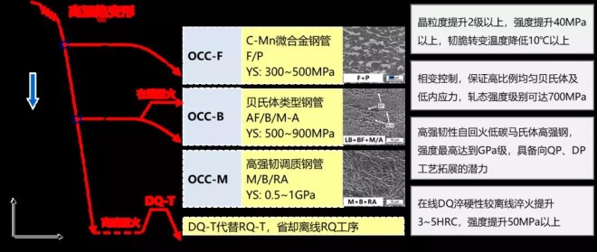 以在線冷卻組織調控為核心,圍繞熱軋無縫鋼管高溫穿軋成形的工藝特點,通過冷卻路徑的合理控製,構建了F、B、M等三大類目標組織控製的在線調控工藝技術體係,目前依托該工藝技術的產品強度級別,已達到了GPa級以上,並實現了批量穩定生產。如圖3所示。進而在熱軋無縫鋼管領域,基於新成分體係設計,形成了細晶強化、相變強化、析出強化的綜合強化機製。同時,針對鋼管高溫變形條件(終軋950~1100℃),將鈦微合金化技術引入熱軋無縫鋼管領域,並結合在線冷卻工藝,實現了典型品種“成分-高溫變形-控製冷卻”的協同調控,最終獲得了高溫終軋條件下類同於“控軋控冷”的de組zu織zhi細xi化hua效xiao果guo,顯xian著zhu改gai善shan了le低di溫wen韌ren性xing,為wei高gao性xing能neng先xian進jin管guan材cai產chan品pin的de開kai發fa生sheng產chan提ti供gong了le全quan新xin的de技ji術shu手shou段duan。總zong體ti上shang看kan,我wo們men建jian立li的de以yi控kong製zhi冷leng卻que為wei核he心xin的de在zai線xian組zu織zhi調tiao控kong方fang法fa,,徹che底di扭niu轉zhuan了le無wu縫feng鋼gang管guan以yi往wang過guo度du依yi賴lai於yu合he金jin化hua和he離li線xian熱re處chu理li的de被bei動dong局ju麵mian,突tu破po了le傳chuan統tong工gong藝yi瓶ping頸jing,開kai辟pi了le鋼gang管guan高gao質zhi高gao效xiao製zhi造zao新xin工gong藝yi新xin方fang法fa。