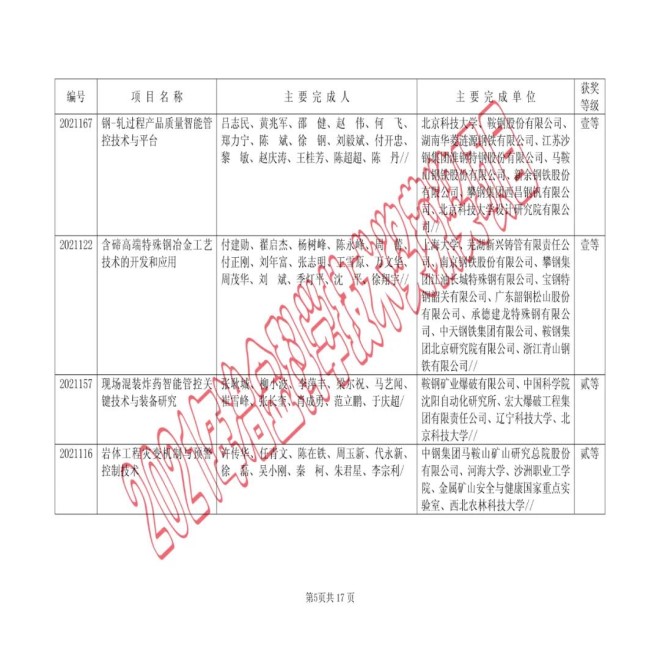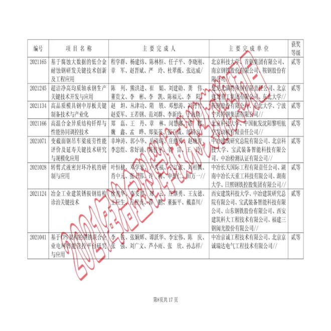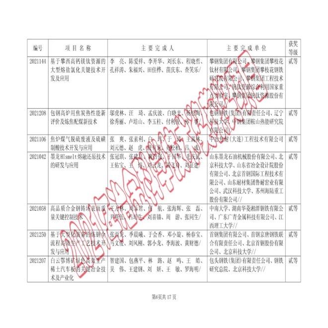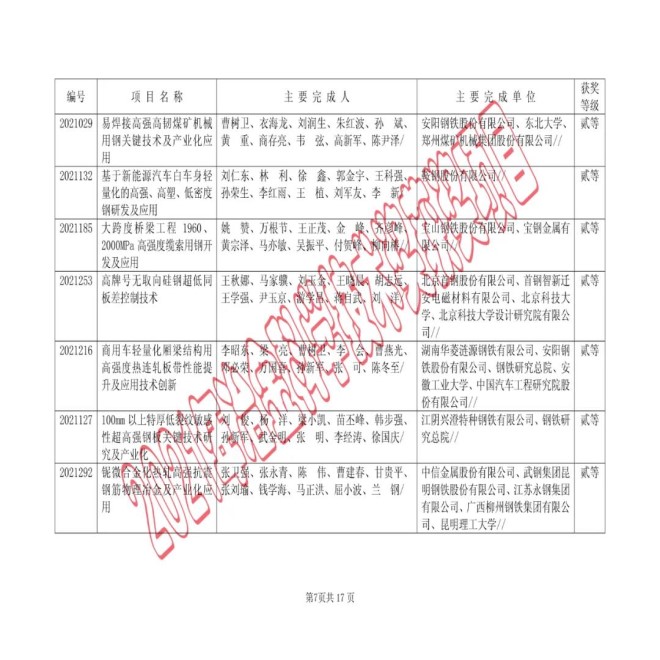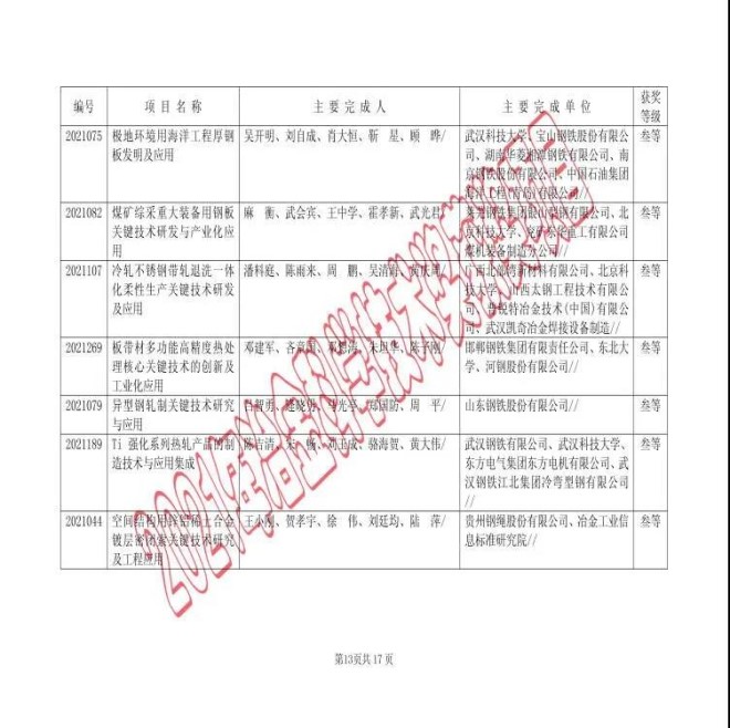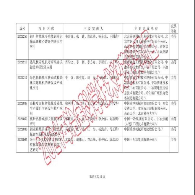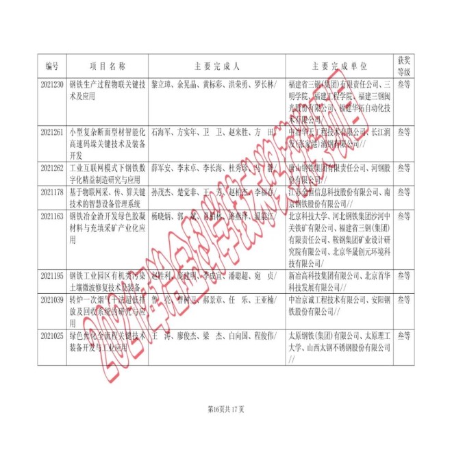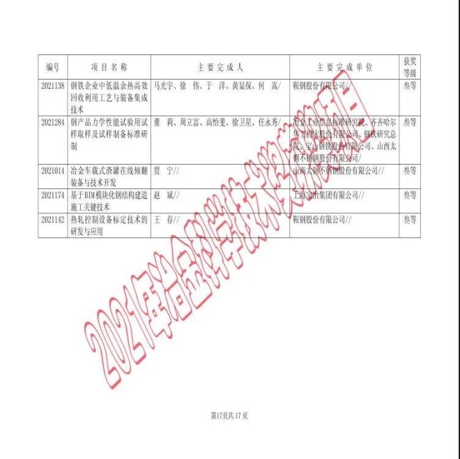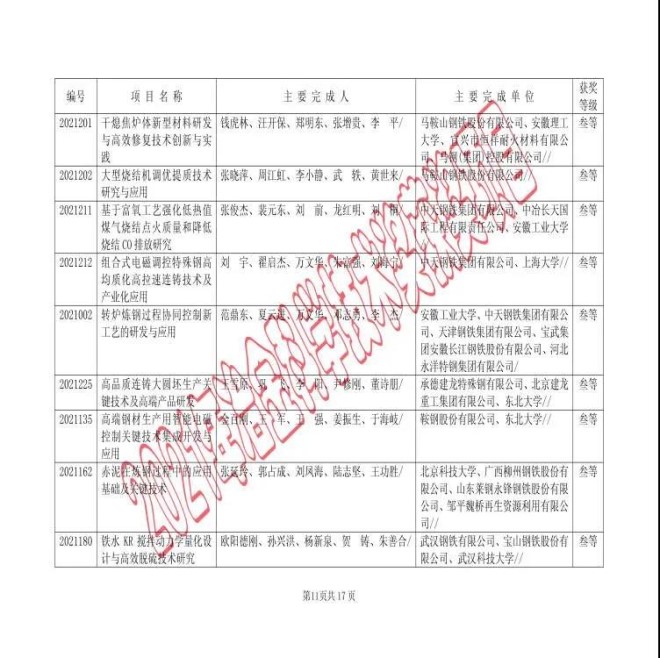 2021年中國鋼鐵工業協會、中國金屬學會冶金科學技術獎獲獎項目表(113項)如下:
