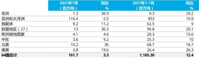 2021年7月全球64個納入世界鋼鐵協會統計國家的粗鋼產量為1.617億噸,同比提高3.3%。