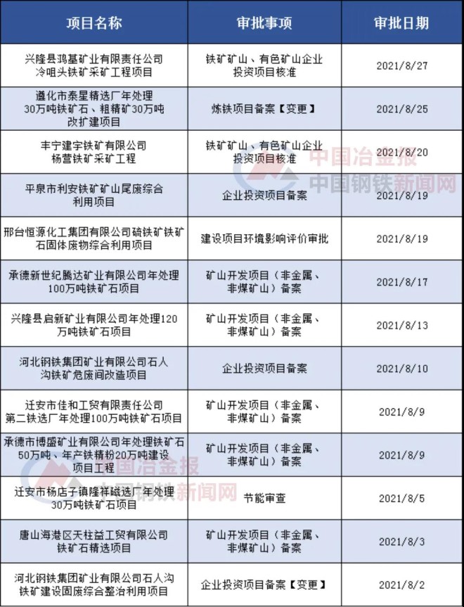 2021年8月,河北省共批複鐵礦石相關項目13個。