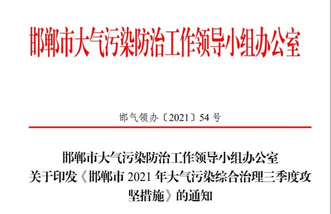 近日,邯鄲市大氣汙染防治工作領導小組辦公室發布了關於邯鄲市2021年大氣汙染綜合治理三季度攻堅措施的通知。