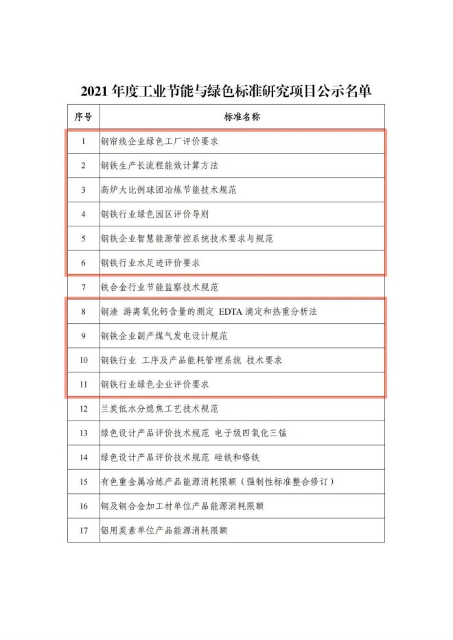 9月6日,工業和信息化部網站發布消息,為充分發揮標準對工業節能與綠色低碳發展的引領支撐作用,經各有關部標準化委托機構、部標準化工作組推薦,並組織專家評審,對2021年度工業節能與綠色標準研究項目進行公示,10個鋼鐵項目入選。