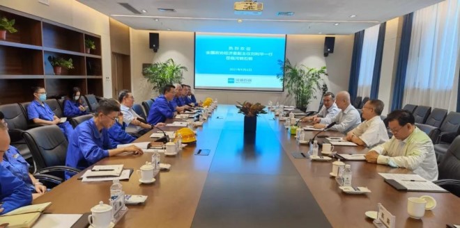 劉利華一行在認真參觀調研產品展廳、技術中心、精品棒材、電爐煉鋼、水處理中心等車間和單位後,與河鋼集團副總經理王新東、石鋼公司董事長黃永建、石鋼總經理張海寧等進行了座談,並就廢鋼采購、用電情況、綠色低碳、兩化融合、智能製造、鋼廠搬遷等方麵進行了深入交流。駱鐵軍對當前我國鋼鐵行業運行、短流程電爐鋼發展、石鋼退城搬遷等做了情況介紹。