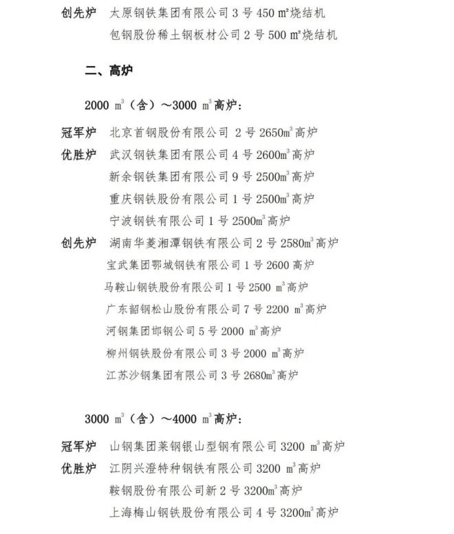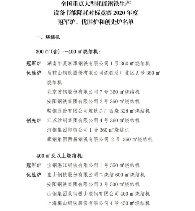 在各參賽企業和廣大職工的共同努力下,2020年(nian)度(du)競(jing)賽(sai)工(gong)作(zuo)已(yi)經(jing)順(shun)利(li)完(wan)成(cheng)。經(jing)競(jing)賽(sai)專(zhuan)家(jia)組(zu)評(ping)審(shen)和(he)競(jing)賽(sai)領(ling)導(dao)小(xiao)組(zu)研(yan)究(jiu),並(bing)在(zai)中(zhong)國(guo)機(ji)械(xie)冶(ye)金(jin)建(jian)材(cai)工(gong)會(hui)全(quan)國(guo)委(wei)員(yuan)會(hui)和(he)中(zhong)國(guo)鋼(gang)鐵(tie)工(gong)業(ye)協(xie)會(hui)網(wang)站(zhan)進(jin)行(xing)了(le)7天公示,最終評選出年度冠軍爐、優勝爐和創先爐。現對獲獎單位進行通報,具體名單附後。