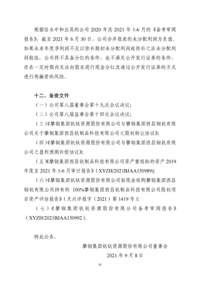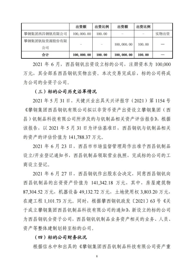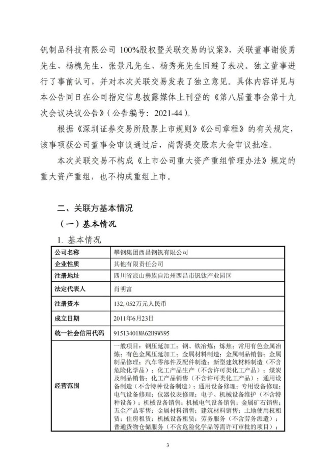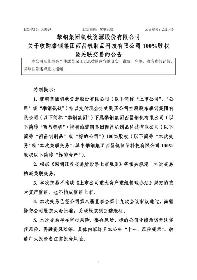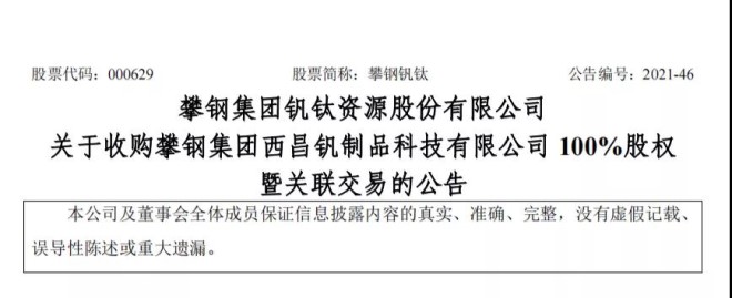 9月8日,攀鋼釩鈦發布了《關於收購攀鋼集團西昌釩製品科技有限公司100%股權暨關聯交易的公告》,該公司擬以支付現金方式,購買公司控股股東攀鋼集團有限公司下屬攀鋼集團西昌鋼釩有限公司持有的攀鋼集團西昌釩製品科技有限公司100%股權。