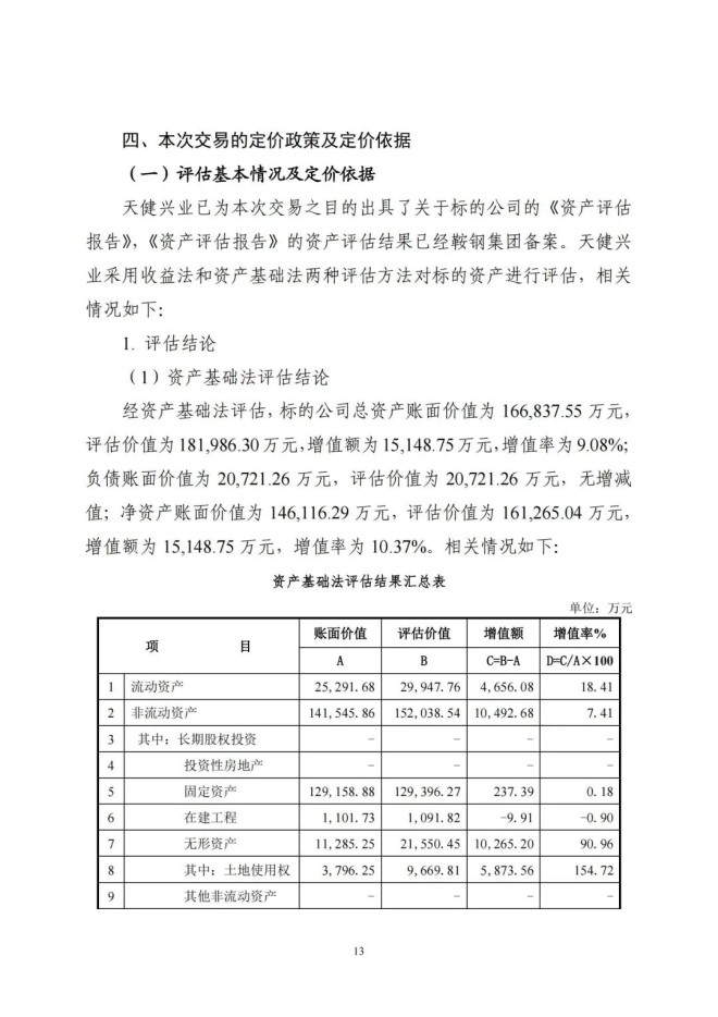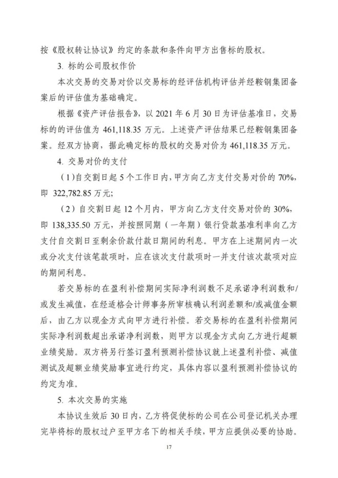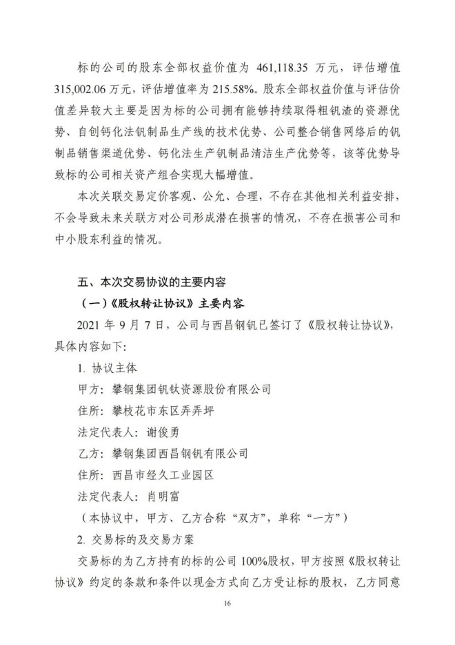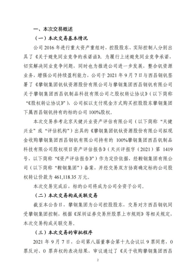 本次交易參考北京天健興業資產評估有限公司出具的《攀鋼集團釩鈦資源股份有限公司擬現金收購攀鋼集團西昌鋼釩有限公司持有的 100%攀鋼集團西昌釩製品科技有限公司股權項目資產評估報告》作為定價依據,經鞍鋼集團有限公司備案,並經交易雙方協商確定標的公司股權轉讓價款為 461118.35 萬元。