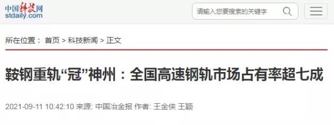 9月10日,中國科技網刊發了《鞍鋼重軌“冠”神州:全國高速鋼軌市場占有率超七成》一文,體現了對《中國冶金報》的《鋼鐵尋“冠”》係列報道的認可和重視,彰顯了我國鋼鐵企業的品牌地位,為鋼鐵行業高質量發展實現進一步強起來的偉大目標提供範例和有益借鑒。