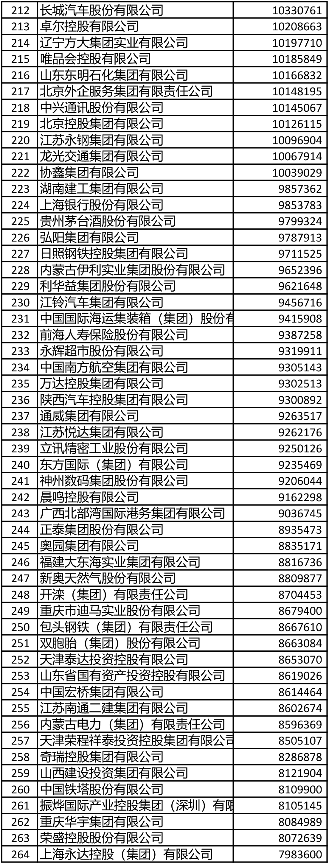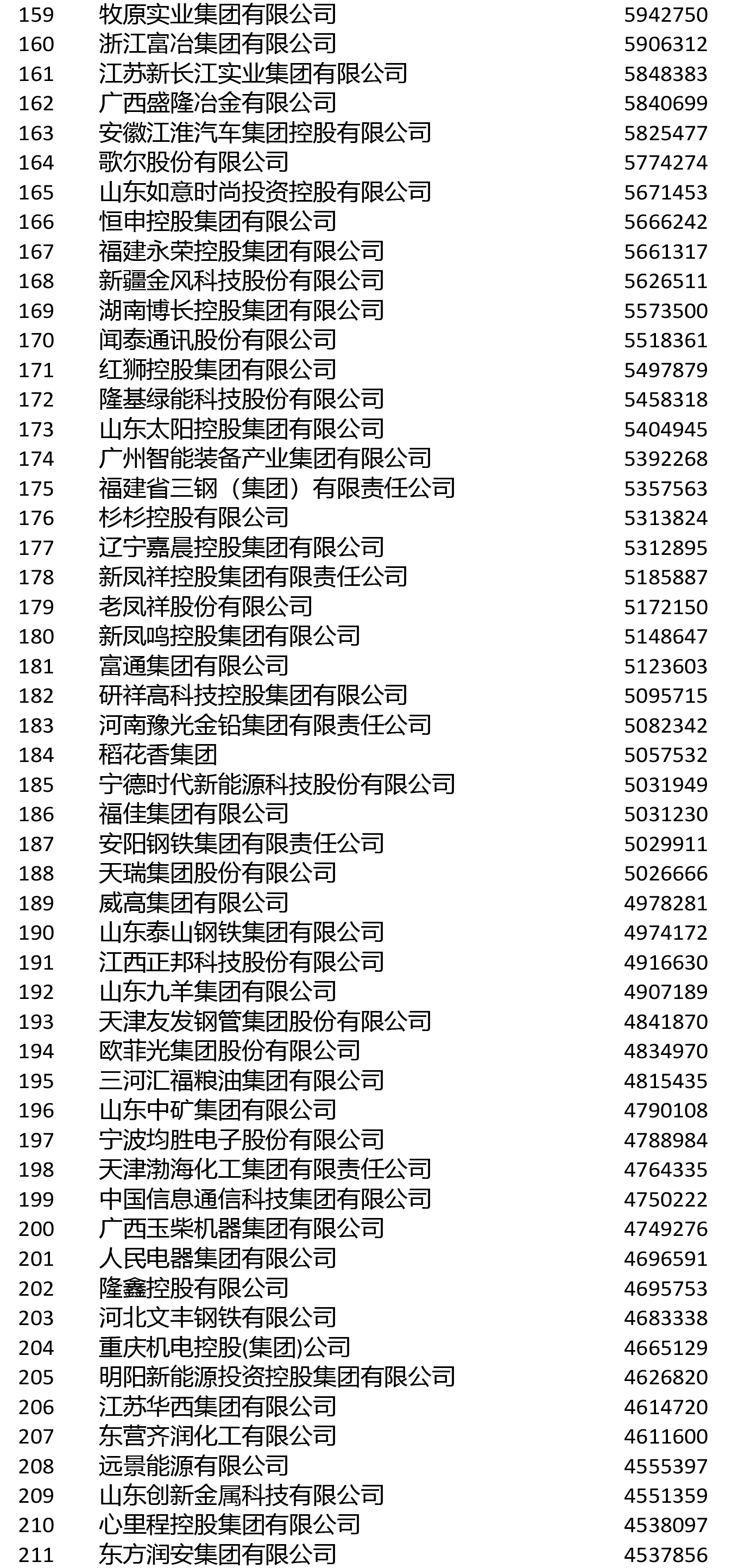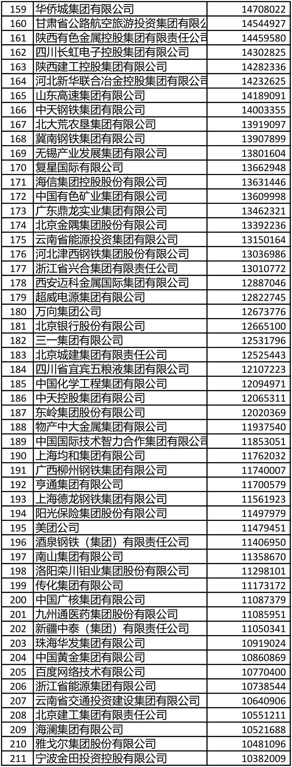 進入前200名的鋼鐵企業還有敬業集團(106)、山鋼集團(108)、鞍鋼集團(111)、首鋼集團(114)、建龍重工(119)、南鋼集團(145)、杭鋼集團(149)、華菱集團(155)、河北新華聯合冶金控股集團(164)、中天鋼鐵(166)、冀南鋼鐵(168)、河北津西鋼鐵(176)、廣西柳鋼集團(191)、上海德龍鋼鐵集團(193)、酒鋼集團(196)。