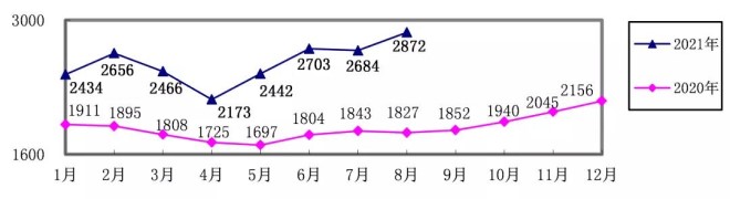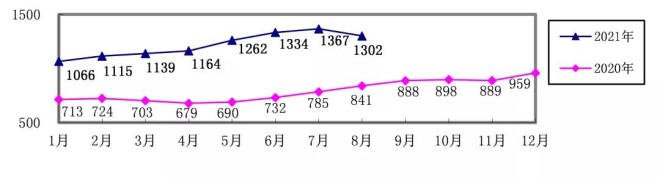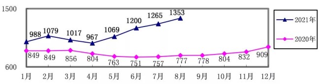 2021年1-8月,煉焦煤累計采購成本同比增長21.65%;冶金焦同比增長40.66%;國產鐵精礦同比增長58.79%,進口粉礦同比增長66.44%;生鐵同比增長38.65%;廢鋼同比增長37.94%。