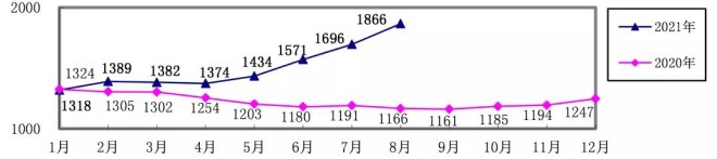 對標企業煉焦煤8月份加權平均折算成幹基的采購成本為1865.88元/噸,環比升高170.35元/噸,升幅為10.05%。1-8月累計平均折算成幹基的采購成本為1504.47元/噸,同比升高267.76元/噸,升幅為21.65%。