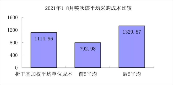噴吹煤8月份加權平均折算成幹基的采購成本為1353.36元/噸,環比升高88.60元/噸,升幅為7.00%。1-8月累計平均折算成幹基的采購成本為1114.96元/噸,同比升高317.17元/噸,升幅為39.76%。