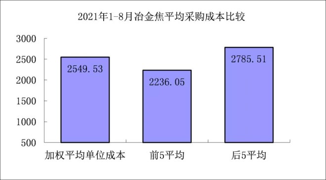 1-8月對標企業冶金焦平均采購成本最低的前5家企業的加權平均采購成本為2236.05元/噸,比對標企業平均采購成本低313.48元/噸,低於平均采購成本12.30%;而采購成本最高的5家企業的加權平均采購成本為2785.51元/噸,比對標企業平均采購成本高235.97元/噸,高於平均采購成本9.26%。