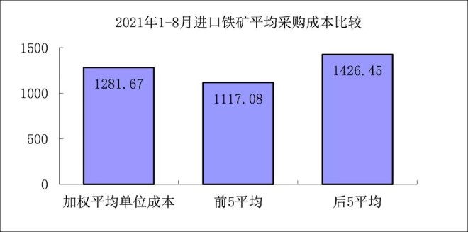 1-8月對標企業進口粉礦折算成62%品位的平均采購成本為1241.65元/噸,成本最低的前5家企業的加權平均采購成本為1111.19元/噸,比對標企業平均采購成本低130.46元/噸,低於平均采購成本10.51%;而采購成本最高的5家企業加權平均采購成本為1385.76元/噸,比對標企業平均采購成本高144.10元/噸,高於平均采購成本11.61%。