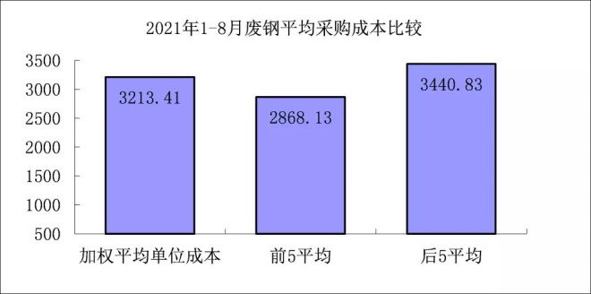 1-8月對標企業廢鋼平均采購成本最低的前5家企業的加權平均采購成本為2868.13元/噸,比對標企業平均采購成本低345.27元/噸,低於平均采購成本10.74%;而采購成本最高的5家企業加權平均采購成本為3440.83元/噸,比對標企業平均采購成本高227.42元/噸,高於平均采購成本7.08%。