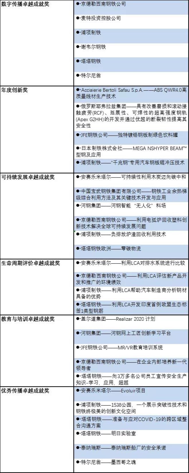 9月27日,世界鋼鐵協會公布了第12屆“Steelie獎”的入圍企業名單。“Steelie獎”旨在表彰在2021年內對鋼鐵行業做出突出貢獻和對鋼鐵行業產生重要影響的會員企業。此次“Steelie獎”設置六個獎項,分別為數字傳播卓越成就獎、年度創新獎、可持續發展卓越成就獎、生命周期評價卓越成就獎、教育與培訓卓越成就獎、優秀傳播卓越成就獎。