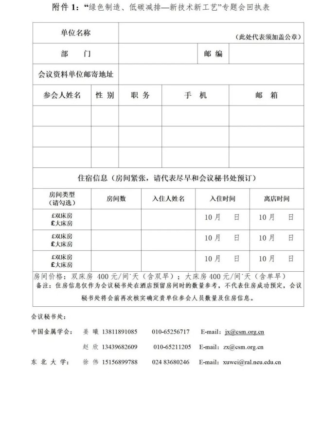 報名截止時間為10月16日。由於疫情防控和會場要求,參會名額有限,有參會意向的鋼鐵生產企業單位,請盡快填寫附件中的報名表,代表須加蓋公章,並與會議秘書處進行參會編號和參會名額確認。會議報名表發送至郵箱:。