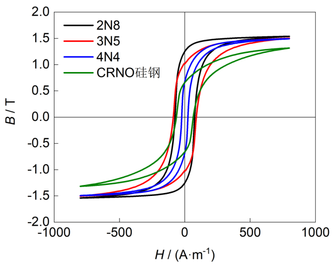 圖為CRNO矽鋼和不同純度純鐵的磁滯回線