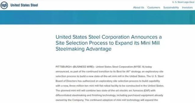 美國東部時間9月16日,美國鋼鐵公司(U.S. Steel Corp.)宣布將斥資約30億美元新建一座鋼鐵廠。