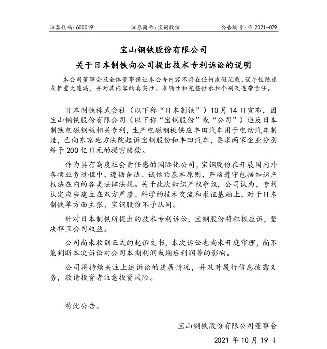 10月18日下午股市收盤後,寶鋼股份發布《關於日本製鐵向公司提出技術專利訴訟的說明》公告。
