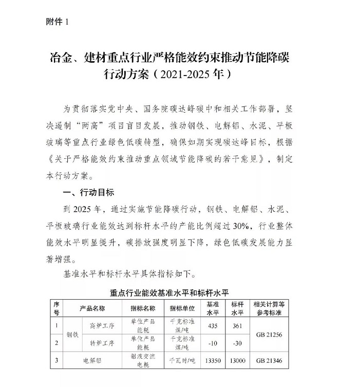 10月21日,國家發展改革委、工業和信息化部、生態環境部、市場監管總局、國家能源局五部門對外發布《關於嚴格能效約束推動重點領域節能降碳的若幹意見》(以下簡稱《意見》),並附上了《冶金、建材重點行業嚴格能效約束推動節能降碳行動方案(2021-2025年)》(以下簡稱《行動方案》),提出到2025 年,通過實施節能降碳行動,鋼鐵、電解鋁、水泥、平板玻璃行業能效達到標杆水平的產能比例超過30%,行業整體能效水平明顯提升,碳排放強度明顯下降,綠色低碳發展能力顯著增強。鼓勵國有企業、骨幹企業發揮引領作用,開展節能降碳示範性改造。改造過程中,在落實產能置換等要求前提下,鼓勵企業實施兼並重組。