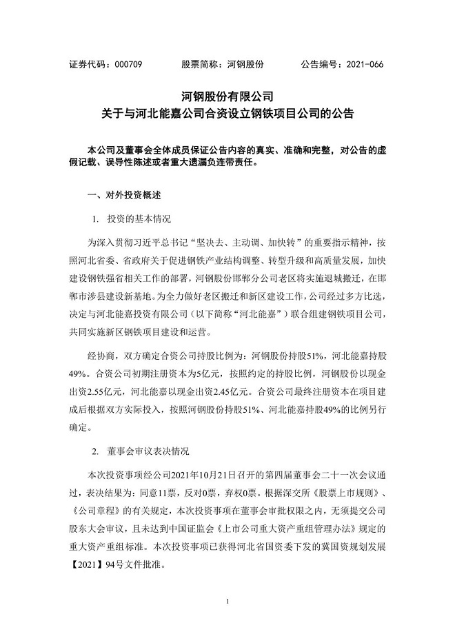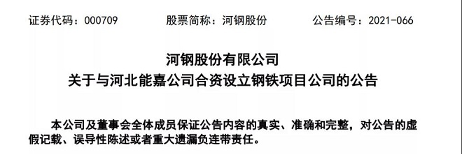 近日,河鋼股份發布關於與河北能嘉公司合資設立鋼鐵項目公司的公告。